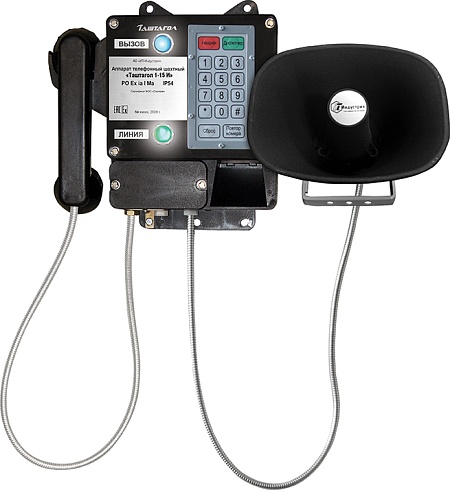 Шахтный телефонный аппарат со световой индикацией вызова «Таштагол 1-15-И» – предназначен для работы в сетях телефонной и громкоговорящей связи шахт, рудников, а также других подземных сооружений. Обеспечивает световую индикацию «Вызов» и «Линия», оснащён громкоговорителем.