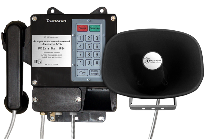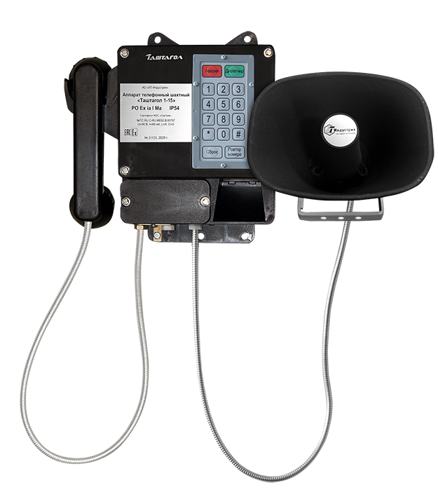 Телефонный аппарат «Таштагол 1-15» взрывозащищённый предназначен для работы в сетях телефонной и громкоговорящей связи шахт, рудников, а также других подземных сооружений, построенных на основе системы учрежденческо-производственной связи и оперативного управления специального применения «Коралл PExl».